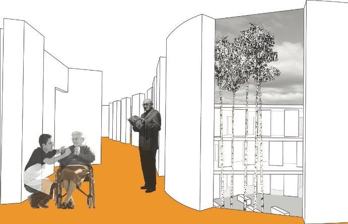 Design of a mixed-use Community Center and Housing for the Elderly in Egg, Austria. The program includes regular housing for the elderly, assisted housing at two different need and support levels, administrative and supportive and common spaces. A small chapel complements the outdoor spaces, which include semi-private and public decks, hidden and shaded seating and a secured walk around for tenants with dementia.